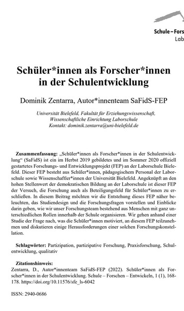 âSchĂŒler*innen als Forscher*innen in der Schulentwicklungâ (SaFidS) ist ein im Herbst 2019 gebildetes und im Sommer 2020 offiziell gestartetes Forschungs- & Entwicklungsprojekt an der Laborschule Bielefeld: https://www.biejournals.de/index.php/sfe_ls/article/download/6042/5516&ved=2ahUKEwi68ZDdprH-AhXoQvEDHfldBHcQFnoECAcQAQ&usg=AOvVaw1GHbv5F9TBXx-Iv0LmzqBk (PDF) #twlz #laborschule #schulentwicklung