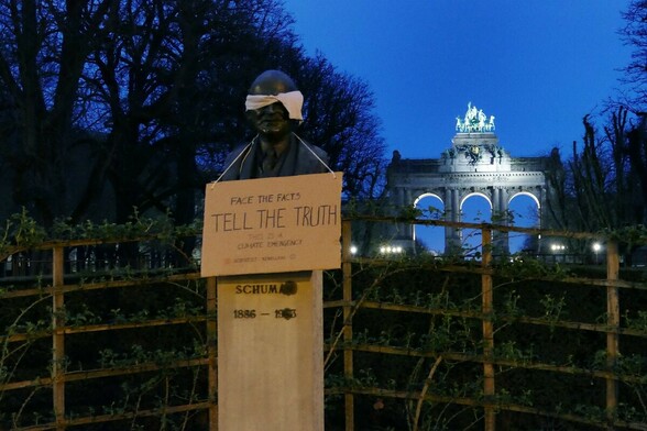 Robert Schuman is blindfolded in Brussels, Belgium. #TellTheTruth #ClimateEmergency #ScienceNotSilence