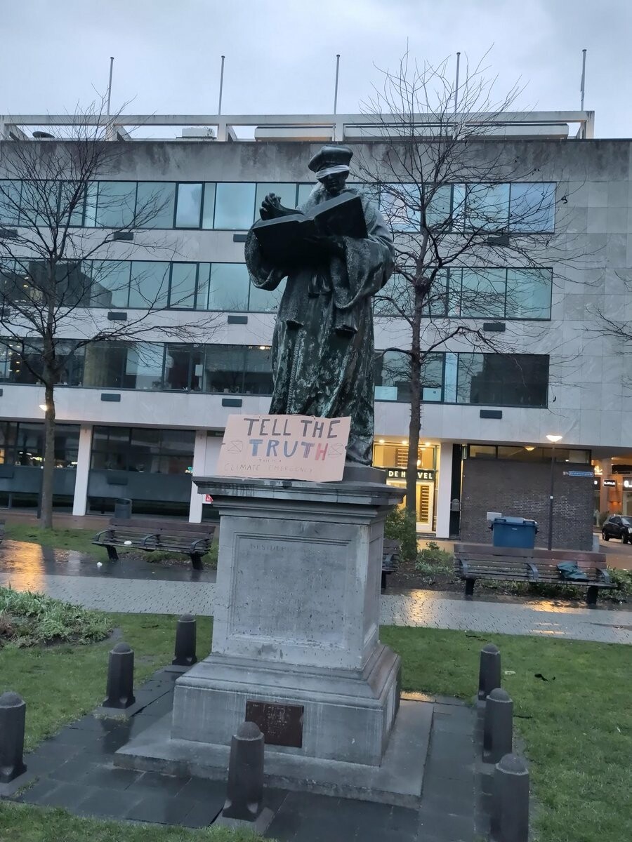 Scientist Rebellion heeft vannacht in 10 landen standbeelden geblinddoekt in reactie op het laatste IPCC rapport. In Nederland: Spinoza (Amsterdam), Christiaan Huygens (Leiden) en Erasmus (Rotterdam). Dit zijn de beelden en de feiten.🧵(1/11)