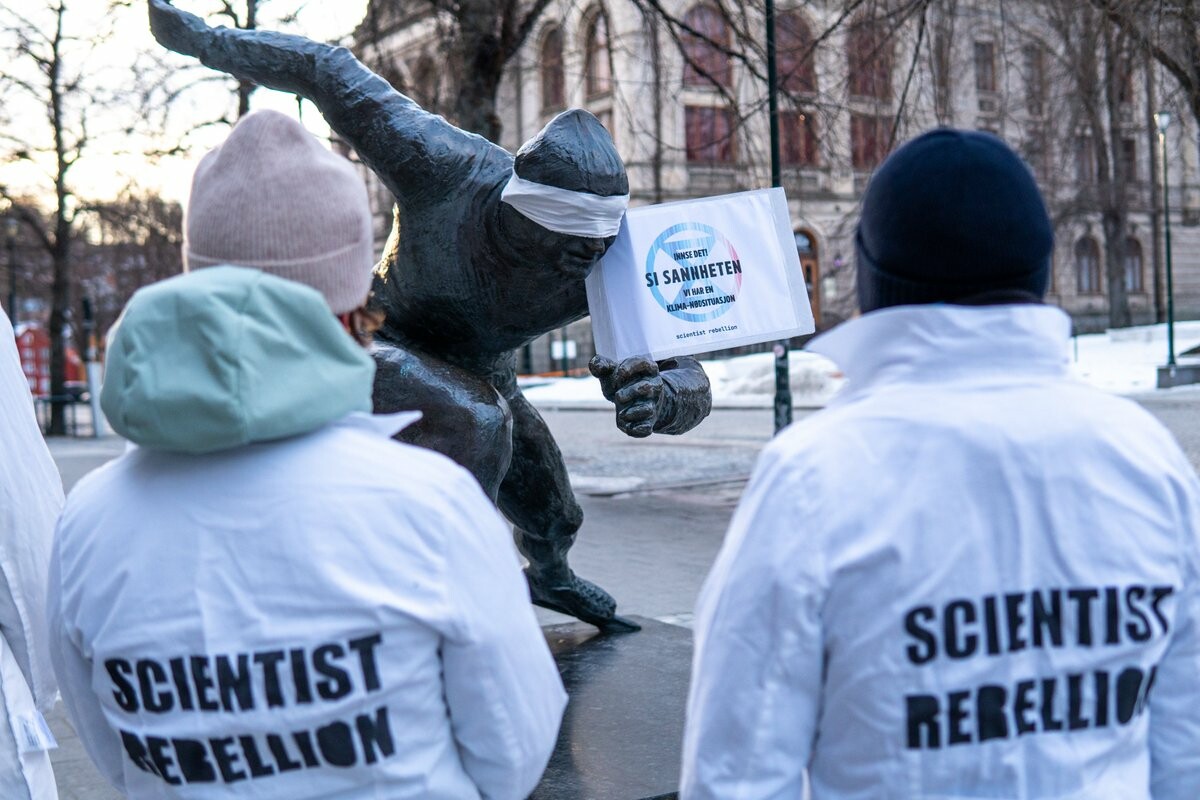 Lisette Klok, klimaatonderzoeker en actief bij Scientist Rebellion, legt tijdens haar eerste actie met Scientist Rebellion uit waarom ‘Het Lieverdje’ in Amsterdam op zondagochtend 2 april van een blinddoek is voorzien.
