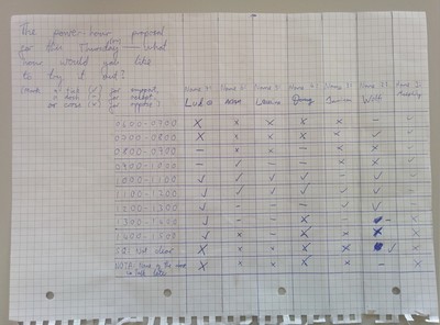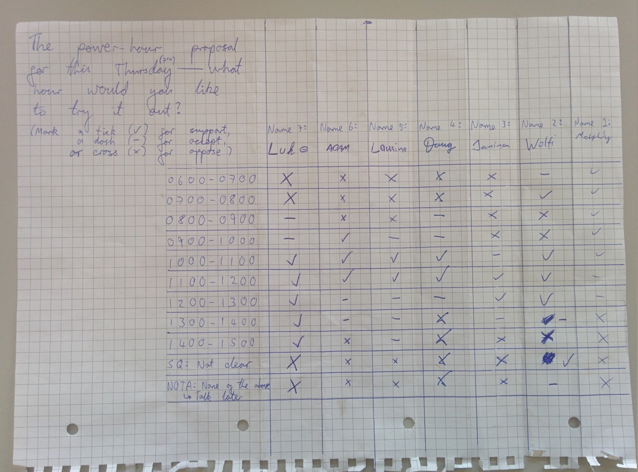We tried out a basic, hand-written poll which made deciding a time way quicker and kept the meeting running. I whipped up a printable one too: https://nc.matthias-larisch.de/s/2Vf4MasWbREJe5u