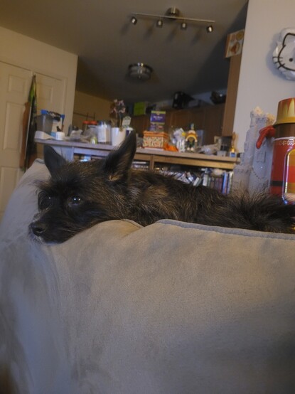 Scrappy the Couch Potato, lying in his favorite spot - the back of the couch.