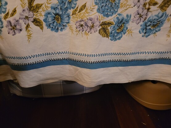 Three dog beds to choose from, but instead he plops down on my side of the bed after making a nest of three blankets, leaving scraps for the rest of us...