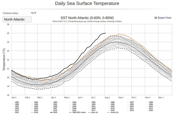 Oh dear!! What do the marine creatures do, Dad, when it gets too hot? North Atlantic #SeaSurfaceTemperatures averaged 25C on August 3, the highest in the observational record.