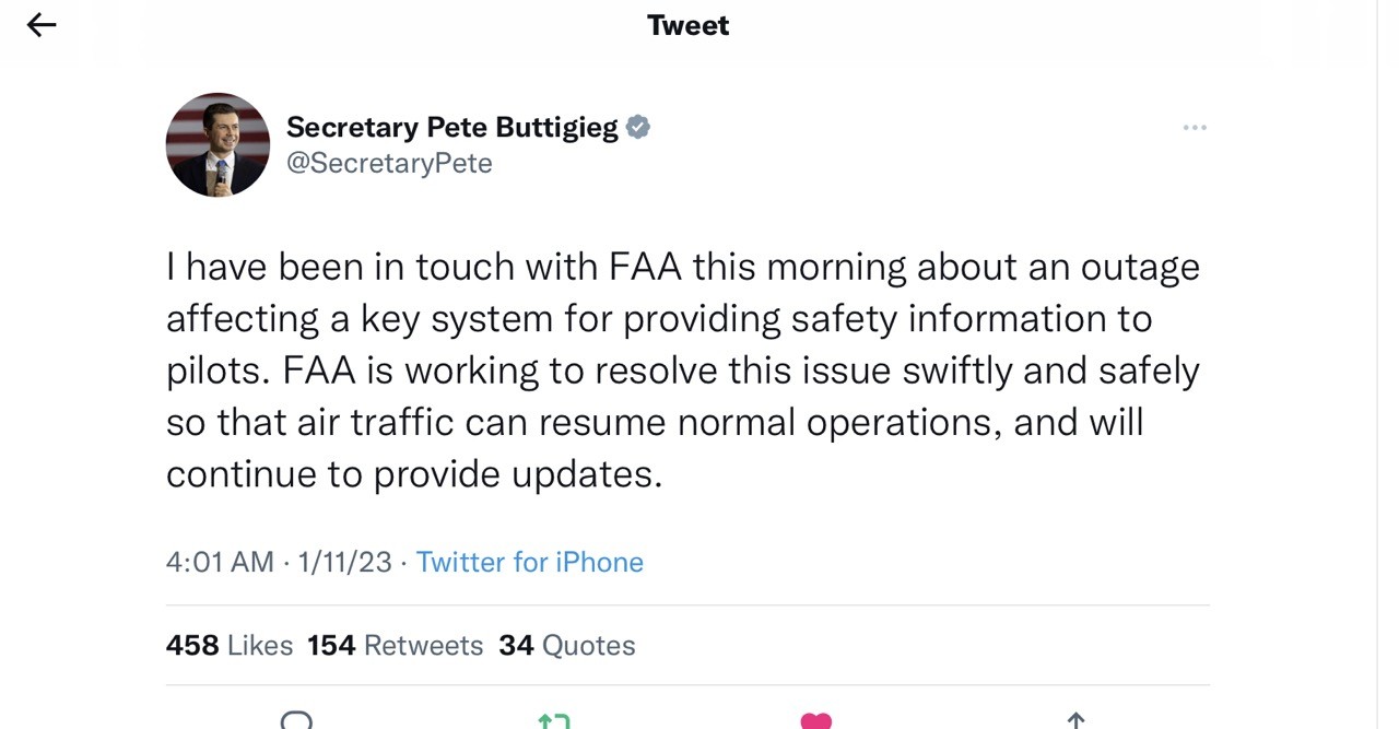 Transportation Secretary Pete Buttigieg: I have been in touch with FAA this morning about an outage affecting a key system for providing safety information to pilots. FAA is working to resolve this issue swiftly and safely so that air traffic can resume normal operations, and will continue to provide updates. #faa #secretarypete #airlines #airports