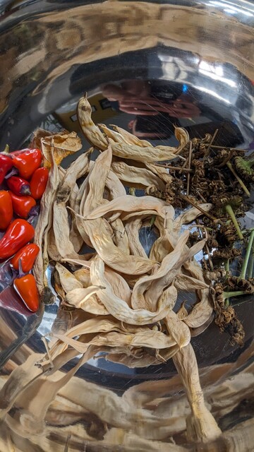 Late summer harvest: a few hot peppers and some seeds. First time trying to save pole beans for next year. I'm a little worried because after de-podding them the beans don't look fully plump. #seedsaving #gardening