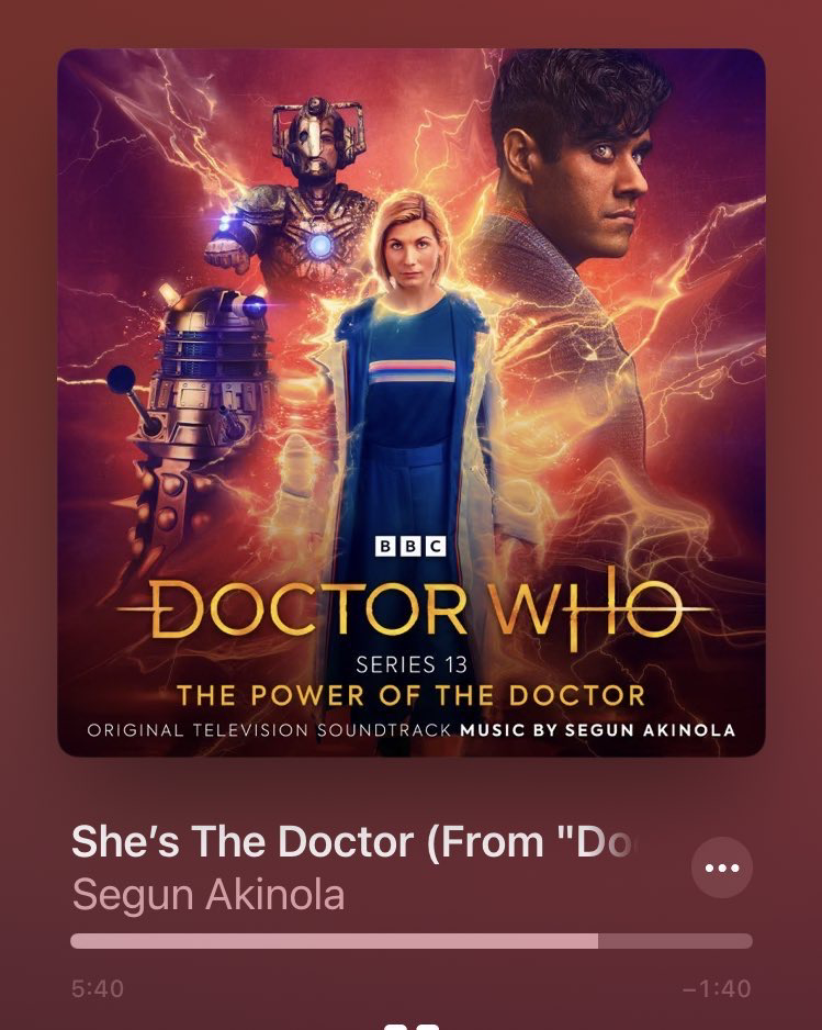 Listening to the final piece in #SegunAkinola’s Power soundtrack (She Is the Doctor) reminds me that actually it took a while for 13 to regenerate. It’s a 6 minute track, which I think covers 13/Yaz realising she’s regenerating… but I still feel like it took nowhere near as long as the other Modern Doctors (apart from 9). Am I blinded by being a fan of the era and ep, or did they balance the saying goodbye without being maudlin very well (yesss)?