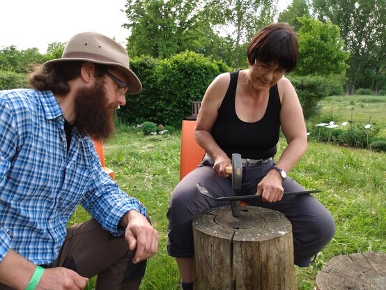 Sebastian Zientek erklärte das Dengeln. Wer hatte, brachte seine Sense mit. Hier eine Kurzanleitung – und Dank der Geduld der beiden Referenten funktioniert es WIRKLICH! https://bienen-leben-in-bamberg.de/reger-zulauf-zum-sensenkurs-im-bamberger-bienengarten-2023/