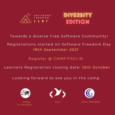 Software Freedom Camp (Diversity Edition) 2022 registrations are open! Register today at https://camp.fsci.in #FreeSoftware #sfcamp #fsci #diversity