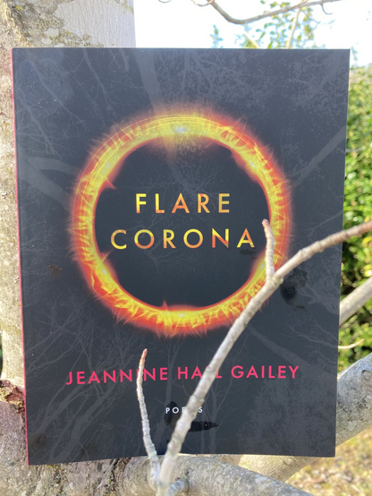 Sitting outside in unseasonable sunshine with an advance review copy of Flare, Corona by the amazing poet Jeannine Hall Gailey. Now available for pre-order! https://www.boaeditions.org/products/gailey #poetry #ms #sfpoetry [alt text for photos: cover and first poem, “Irradiate,” from Flare, Corona]