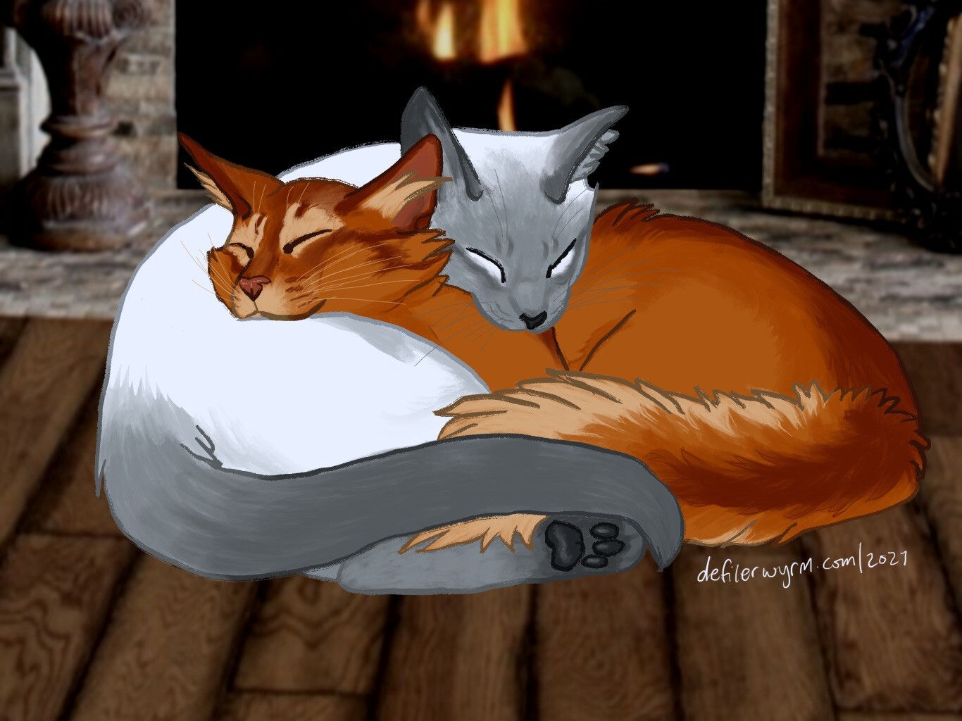 I’m procrastinating so here’s another art piece, a more recent one: a #Shadowgast polymorph cuddle puddle. Catleb is a Somali, Essekitty is a blue-point Siamese, and they are both purring *so loud.*