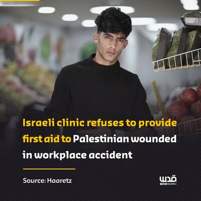 An Israeli clinic reportedly refused to provide first aid to a Palestinian youth hurt while working, forcing him to leave the clinic still bleeding upon finding out he was Palestinian.