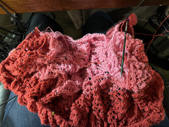 My current knitting project on my needles. Another Anna Victoria lace knit shawl. I’m working on using up some leftover reds. #shawlknitters #knittersofmastadon @knitting