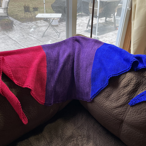 A second post before the first week of color is over: my recently finished Invisibility Shawl. While I was knitting it, a friend said "Those colors are super bright! Isn't that the opposite of invisible?" and I said "and you have nailed some of the irony in the bi flag..."