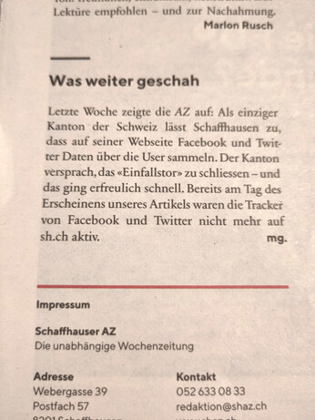 Nach dem Bericht der Schaffhauser AZ #SHAZ über die #Twitter- und #Facebook-#Dateninkontinenz der Website des Kantons #Schaffhausen wurden die #Tracker entfernt. Leider berichten die #Medien kaum über solch konkrete #Datenschutz-Themen. Vermutlich, weil sie fast flächendeckend selber dateninkontinent und deshalb befangen sind.