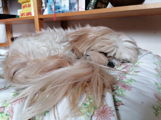Kääryläinen ei värähdäkään, kun kuvaan, mutta taisi kumminkin silmä vähän raottua? #koirat #DogsOfMastodon #shihtsu