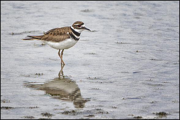 The KIlldeer, Charadrius vociferus, is a large plover found both along the coast and inland locations. This wild bird was feeding in the shallow water at low tide.