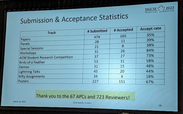#SIGCSE2023 stats: co-author on 1 accepted paper and 2 accepted posters, around topics of #FP and #Python edu.