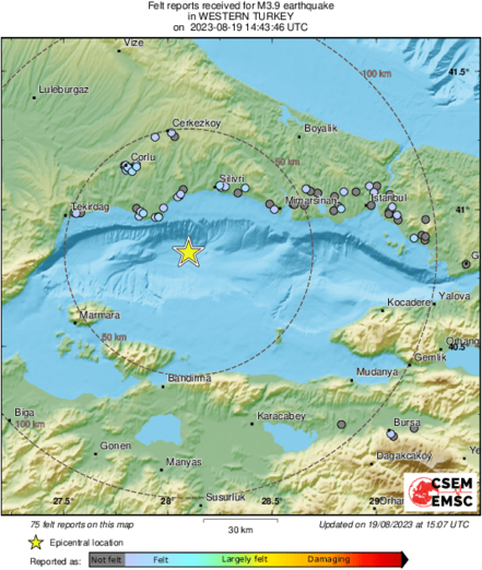#Earthquake 28 km S of #Silivri (#Turkey) 26 min ago (local time 17:43:46). Colored dots represent local shaking & damage level reported by eyewitnesses. Share your experience via: