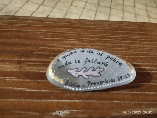 Encontré una piedra con un mensaje sobre un banco.