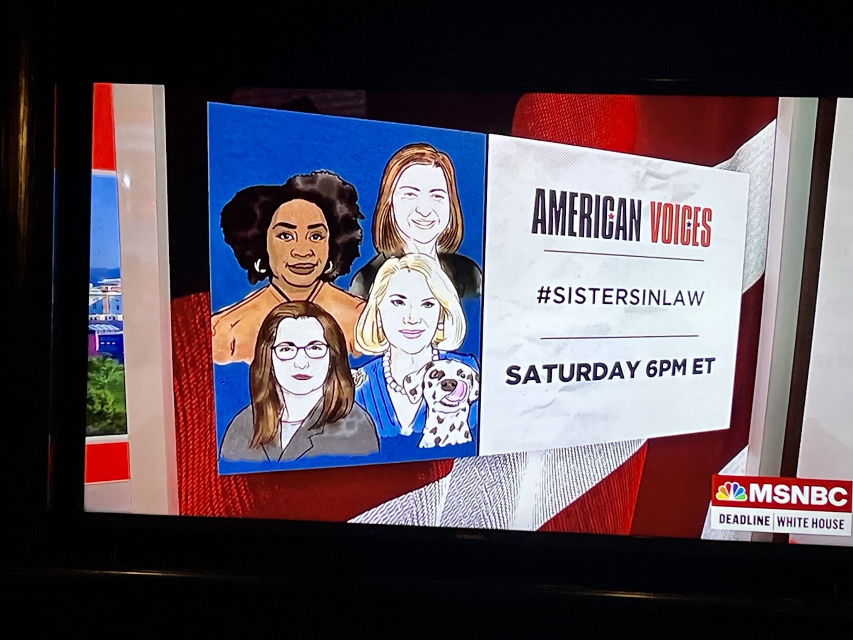 So exciting! The #SistersInLaw live is a sellout and @JoyceWhiteVance @BarbMcQuade @KimberlyEAtkins & I are honored to be guests on @AliciaOnMSNBC this Saturday for the full 6 pm ET hour. @NicolleDWallace had this ad for that show which we all -- including Brisbie -- loved.
