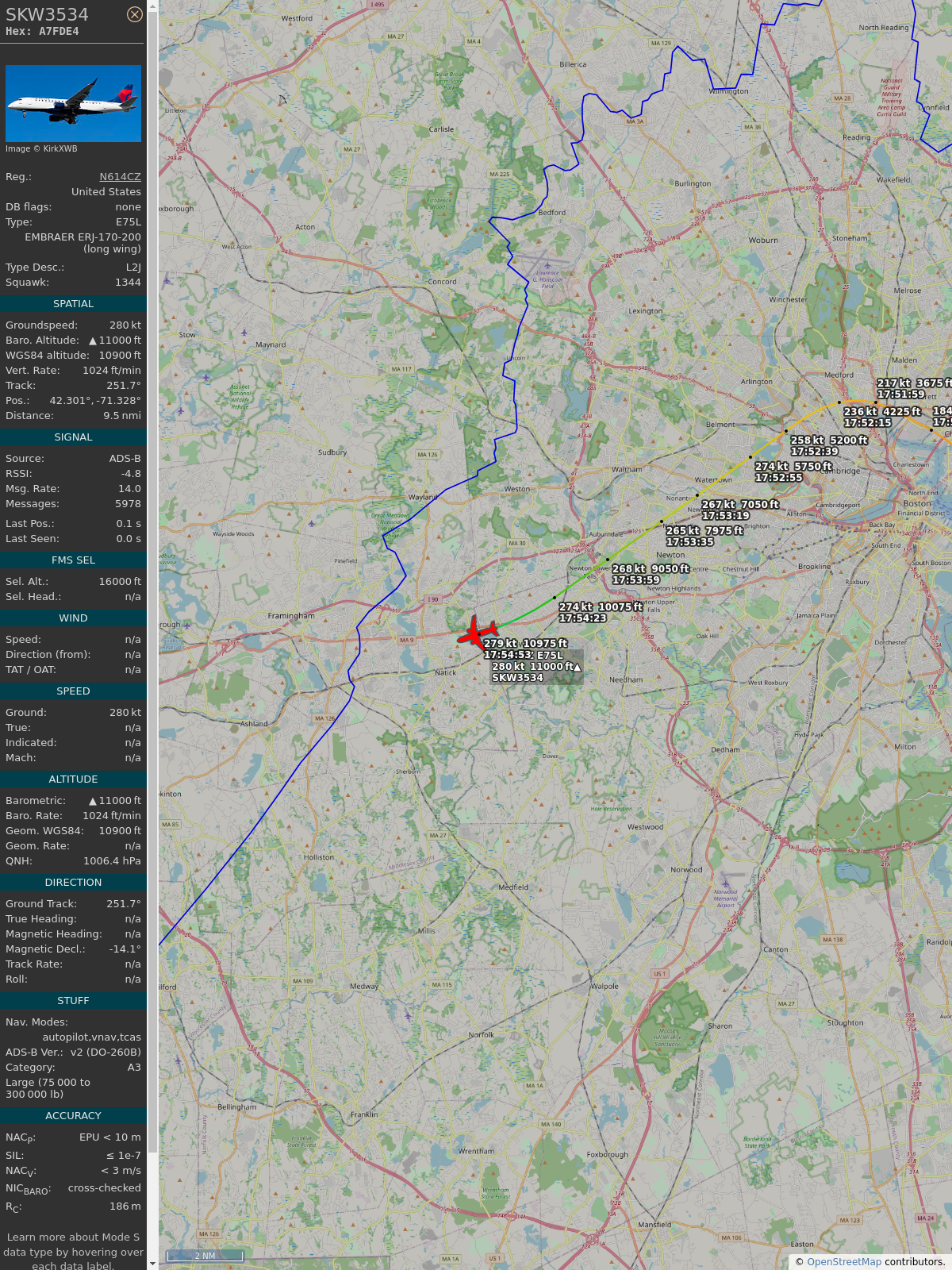 #KBOS / #KPVD - #SKW3534 (ERJ 170-200 LR E75L) Skywest Airlines @ 11000 ft and 30.3° frm hrzn, heading NE @ 17:38:15 - https://globe.adsb.lol/?icao=A2845B #adsb #AnyFlightTracker #rtmladsb #Boston