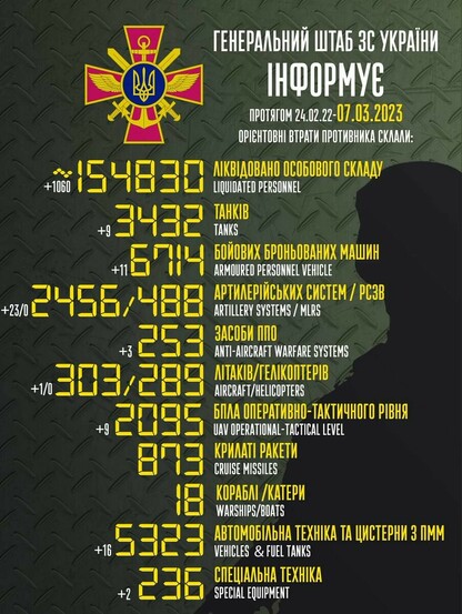 Sprunghafter Anstieg der russischen Verluste. 1060 Mann tot. 20 gepanzerte fzg.Also im Verhältnis wenig gerät eingesetzt aber massive ungedeckte sturmangriffe. Dazu 23 Artisysteme vernichtet. 5 Flugabwehrsysteme,16 Logistikkfz.Knochenmühle Bakhmut mahlt. Teurer Tag für Russland
