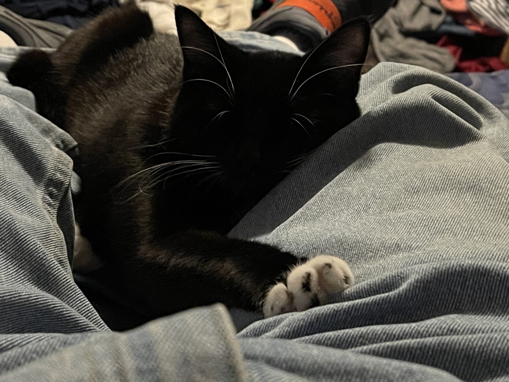 Cuando tu gata duerme con la cara hundida en el pantalón 🔊 y notas el calorcito de su nariz en la pierna :owi: Pendiente de si respiraba para despertarla 😅