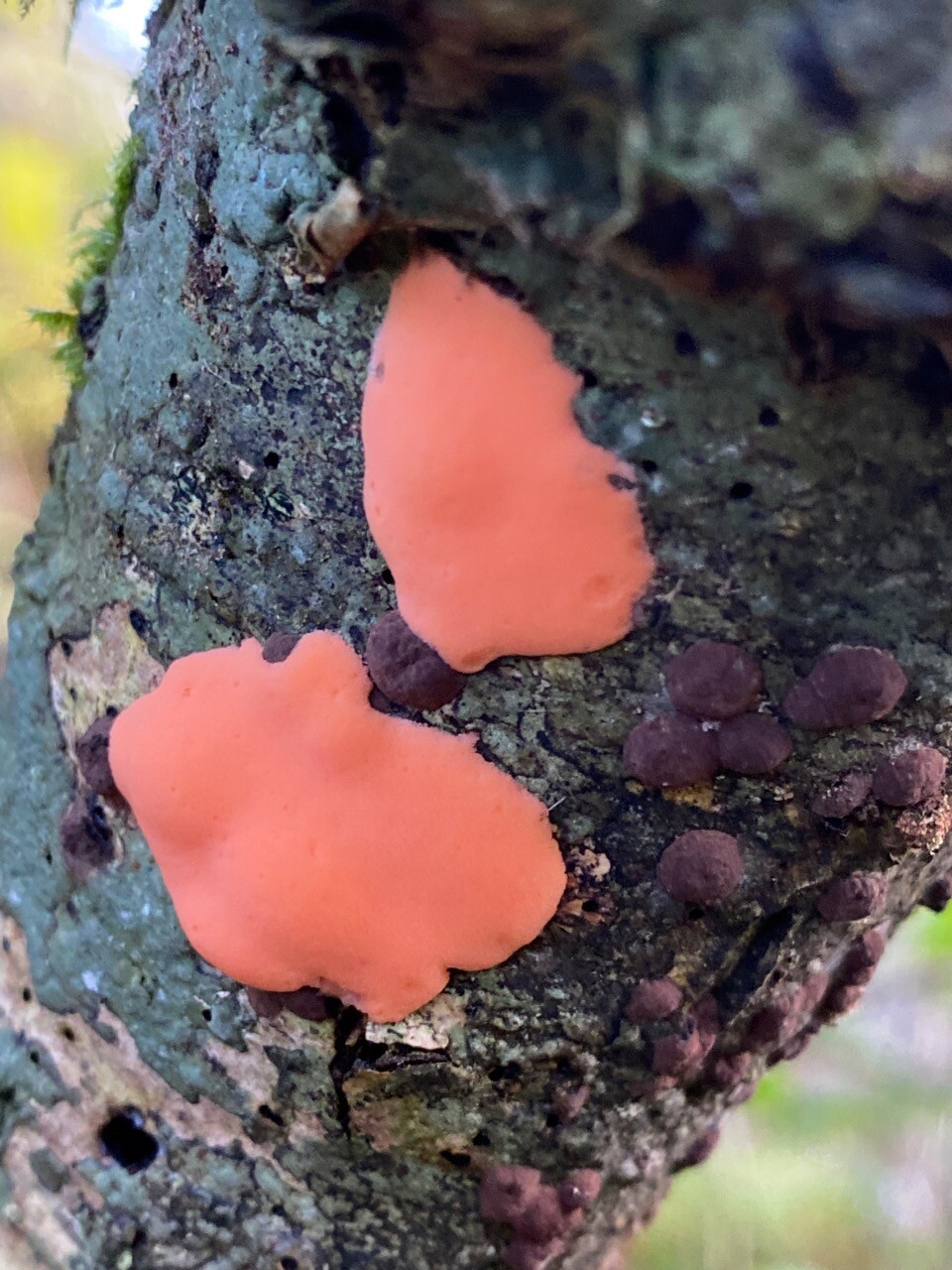 Looking rather like splats of bubble gum, it’s sexy slime mold time! No idea of ID. Perhaps Dictydiaethalium?