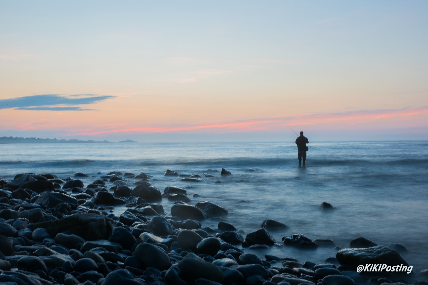 Good morning friends! One early morning along the York, Maine coast, I was setting up to take some sunrise photos. To my surprise, there was a fisherman standing there. Nubble Lighthouse is off in the far distance & the sun was going to come up in about 30 minutes. Normally I do not like people in my sunrise shots, as they are in slow shutter speed, but this worked perfectly.