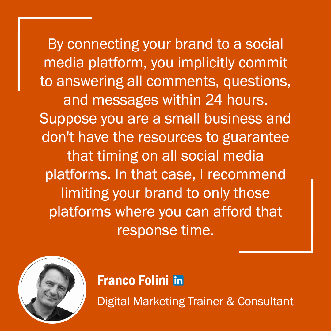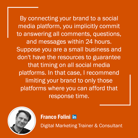Suppose you are a small business and don't have the resources to guarantee that timing on all social media platforms. In that case, I recommend limiting your brand to only those platforms where you can afford that response time.