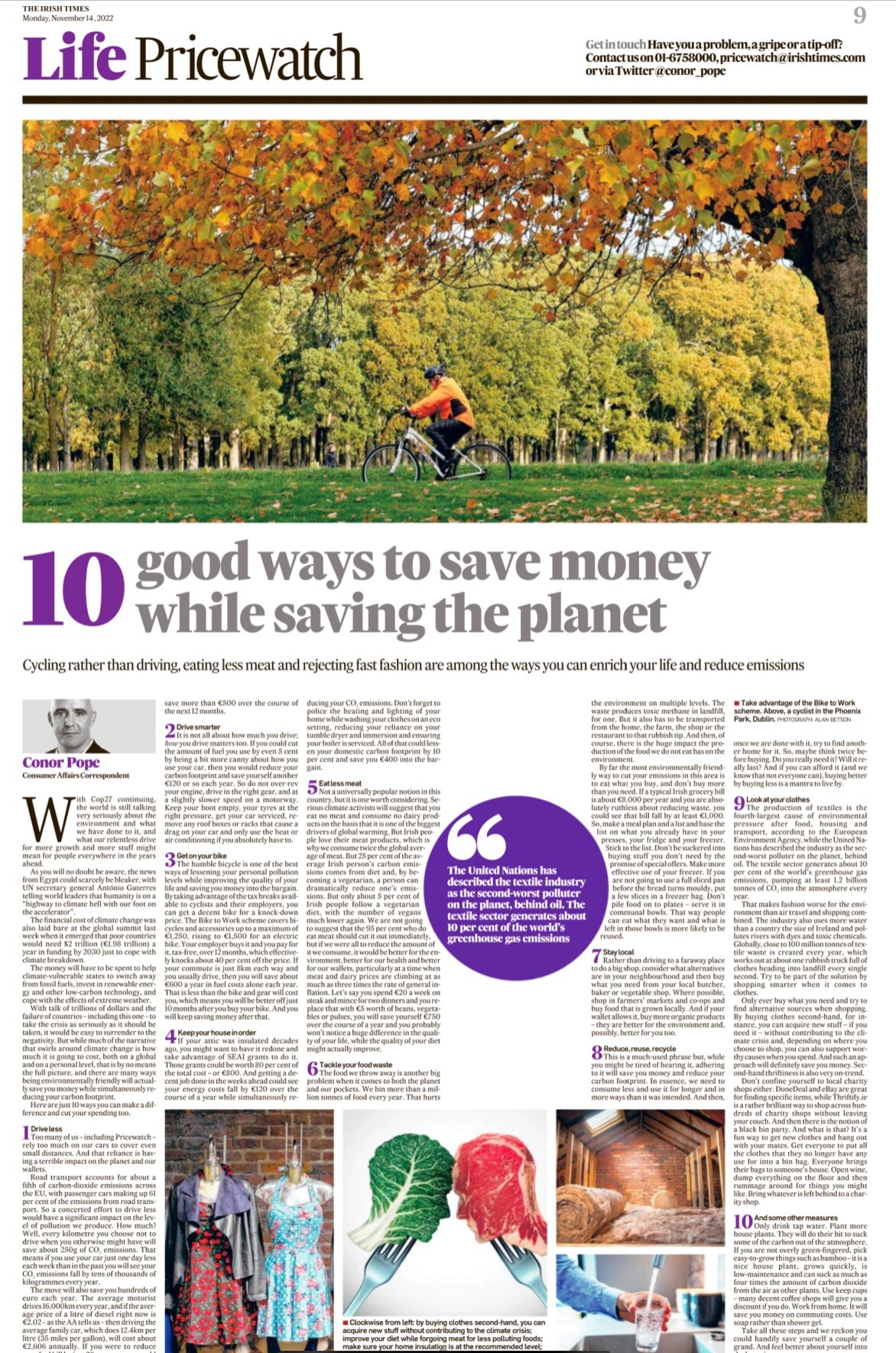 In today’s Irish Times,, Consumer Affairs Correspondent Conor Pope writes about "10 good ways to save money while saving the planet."