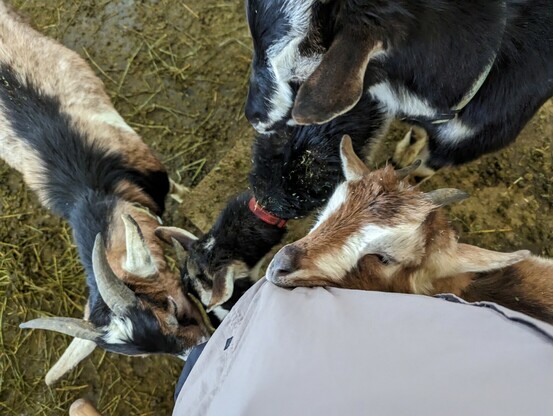 The littles chew on anything... me especially 😅 #CityGrazing #goatsofmastodon #snacktime