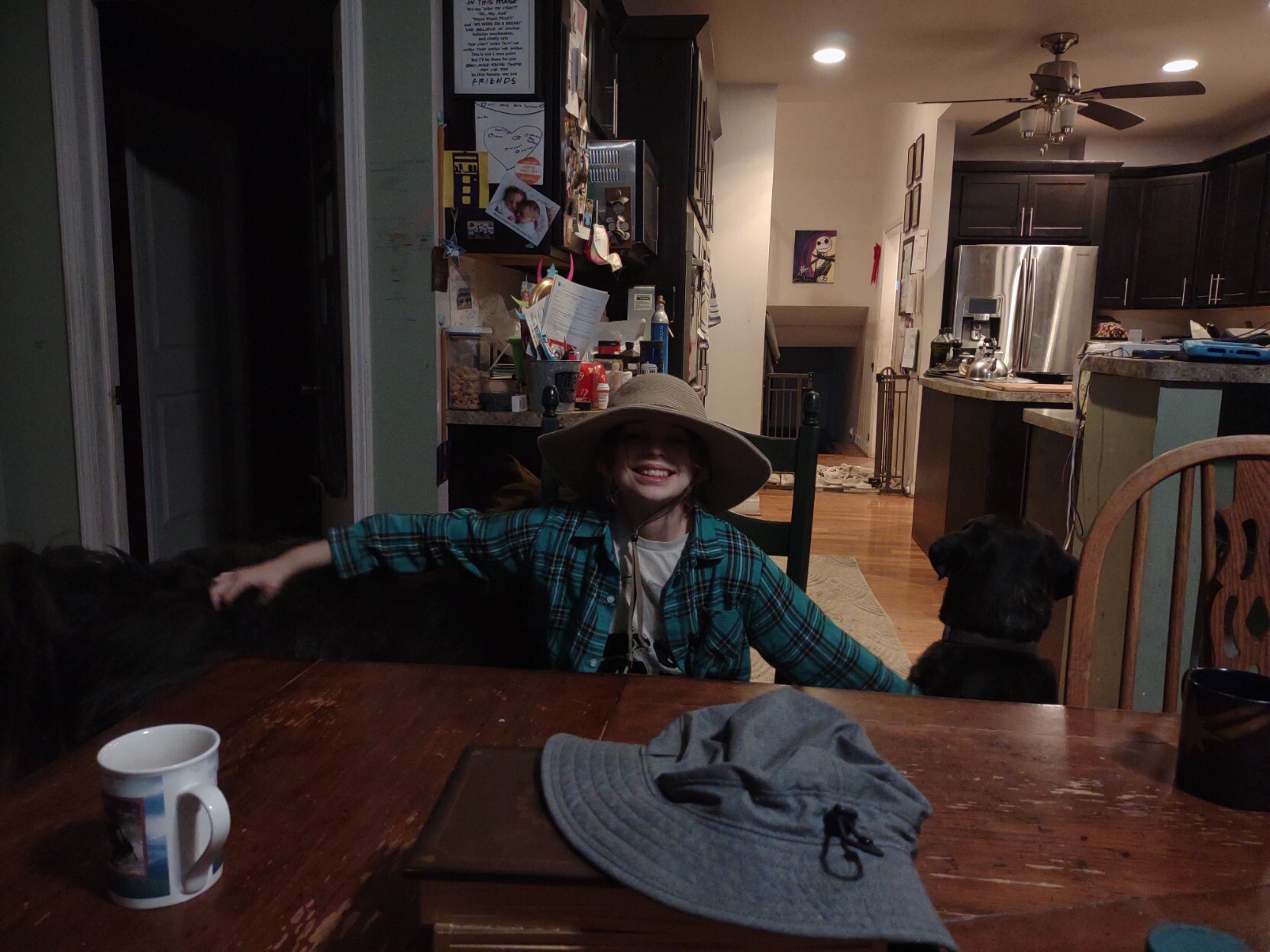 Vivian having "vacation dress" day for school. Last day before #SpringBreak plus a lovely #Sunset I caught last night waiting for my son to finish lessons. #DogsOfMastodon ##SoFluffy