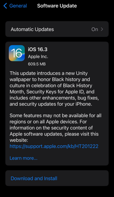 To install the update, open the Settings app, and select General > Software Update > Update to iOS 16.3. If your iPhone is on automatic update, it will download and install iOS 16.3 on the user's behalf.