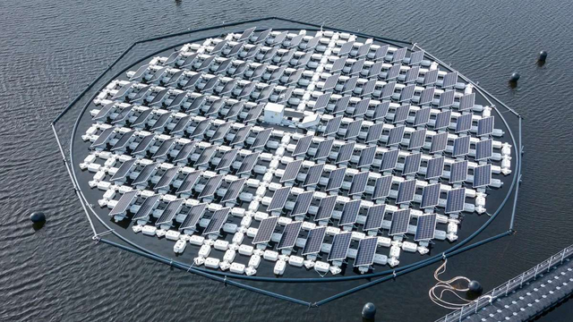 Diese schwimmende Solarinsel in den Niederlanden braucht wenig Platz, soll aber 40 Prozent mehr Ertrag bringen. Das Cleantech-Unternehmen dahinter stammt aus Portugal (Cleanthinking