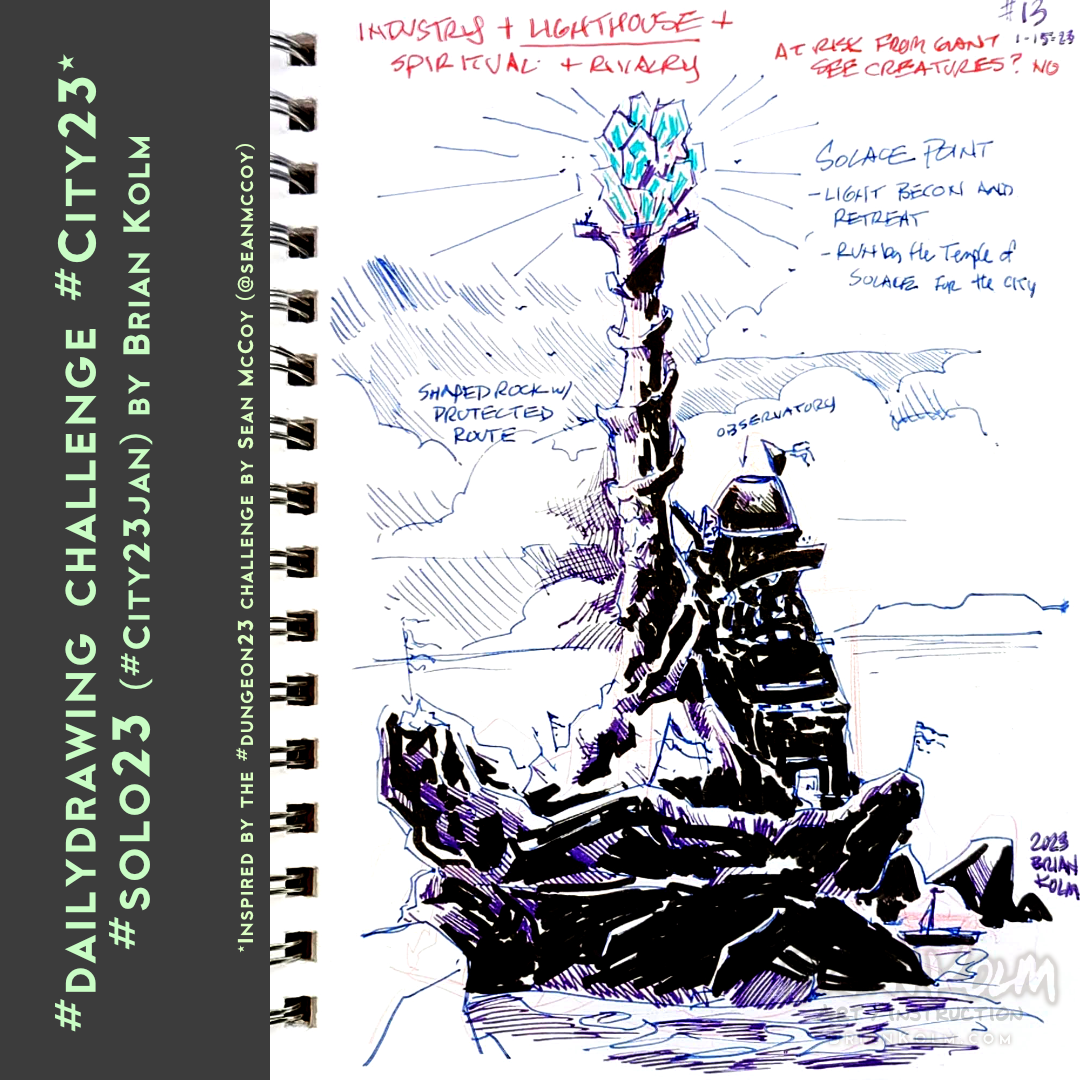 This week the #city23 worldbuilding #drawing prompt: Jan 8-14 Industry + lighthouse + spiritual + rivalry.