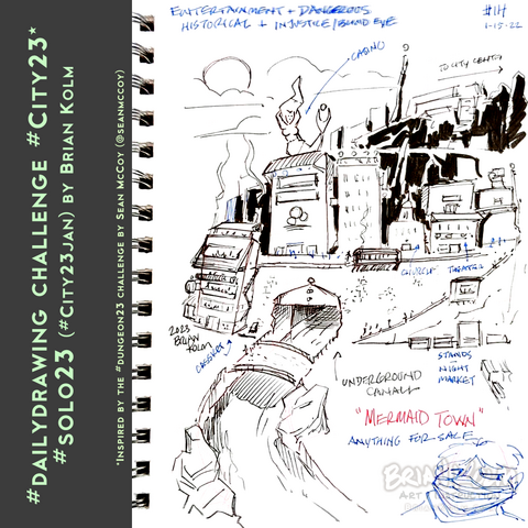 This week the #city23 worldbuilding #drawing prompt: Jan 8-14 Industry + Entertainment + Dangerous, Historical + Blind Eye