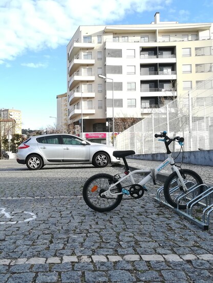 Sábado e está visão de um futuro possível. A bicicleta terá ficado esquecida à porta da escola. Sem cadeado. Em #solum #coimbra #portugal. Uma das capitais portuguesas do caos rodoviário, de segunda a sexta feira. Não antecipo melhoras para a geração da bicicleta, só muitos carros elétricos. Hoje ganha o meu pessimismo. #bicicleta #cycling #urbancycling