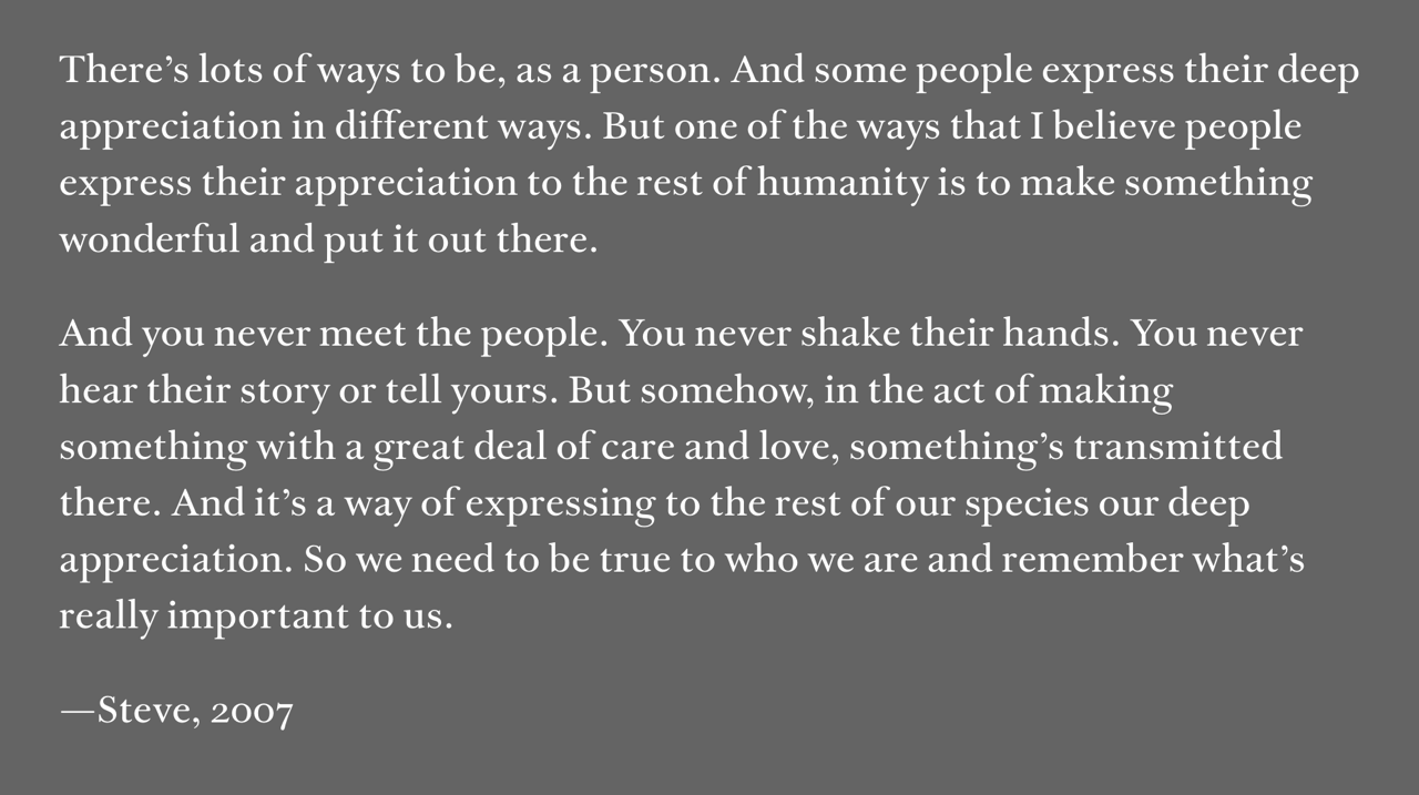 “There's lots of ways to be, as a person. And some people express their deep appreciation in different ways. But one of the ways that I believe people express their appreciation to the rest of humanity is to make something wonderful and put it out there.” --Steve, 2007