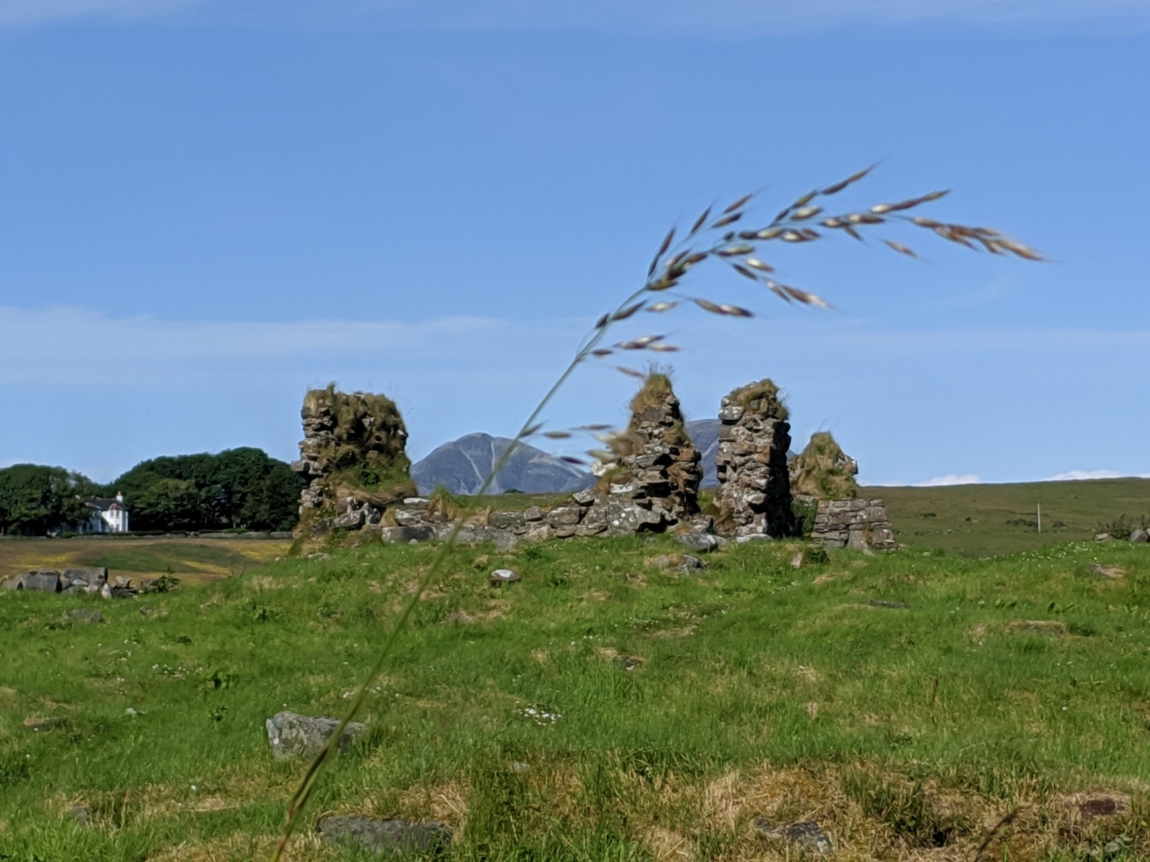 Sonne und blauer Himmel gegen das Grau in Grau. Und Schottland-Sehnsucht. Finlaggan auf Islay mit den Paps of Jura im Hintergrund.