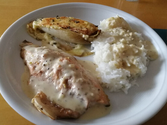 Gebratener Saibling mit Senfsauce und Reis, dazu karamellisierter, überbackener Chicorée. Nachtisch Erdnussparfait mit Papayapüree. #Sonntagsessen