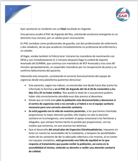 Comunicado acerca del incidente ocurrido en Arganda el sábado 26 noviembre.