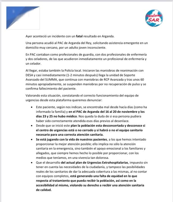 Comunicado sobre INCIDENTE GRAVE DE SEGURIDAD ocurrido en un Centro de urgencias extrahospitalarias sin la dotación necesaria profesional ni material.