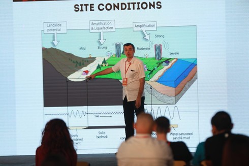 Danijel Schorlemmer introducing the OpenStreetMap-based exposure model translating the local shaking into probabilistic loss and risk assessments expressed as effects on buildings and people. #SotMSEE