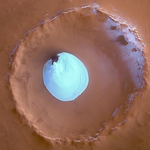 Spectacular image, made by ESA's Mars Express probe, shows the deposition of water ice at the bottom of a crater on Mars near the planet's North Pole, this crater is 35 km in diameter and 2 km deep.
