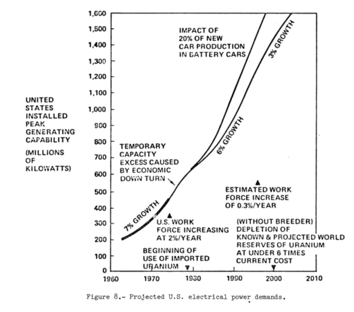 From a 1977 Boeing report on Space Solar Power (giant satellites to beam solar power to Earth), a plot predicting 20% of cars to be battery powered by 1990, and depletion of Uranium reserves by 2000!