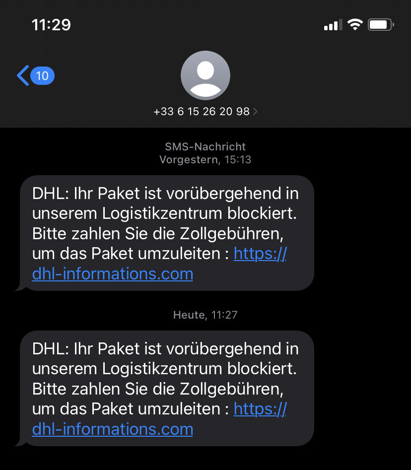 Achtung - das ist SPAM. Eine Message von DHL, dass ein Paket wegen fehlender Zollgebühren festhängt …
