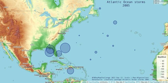 DataSource: {leaflet} package data Atlantic Ocean storms 2005. Scales: 500km to 500 mi