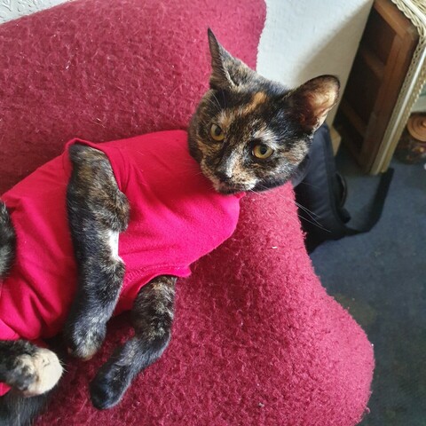 Poor Phryne a very sleepy puss today after her trip to the vets. Glad that she calms down when I stroke her. She hates her post op onesie though. #catsofmasodon #spayyourcat